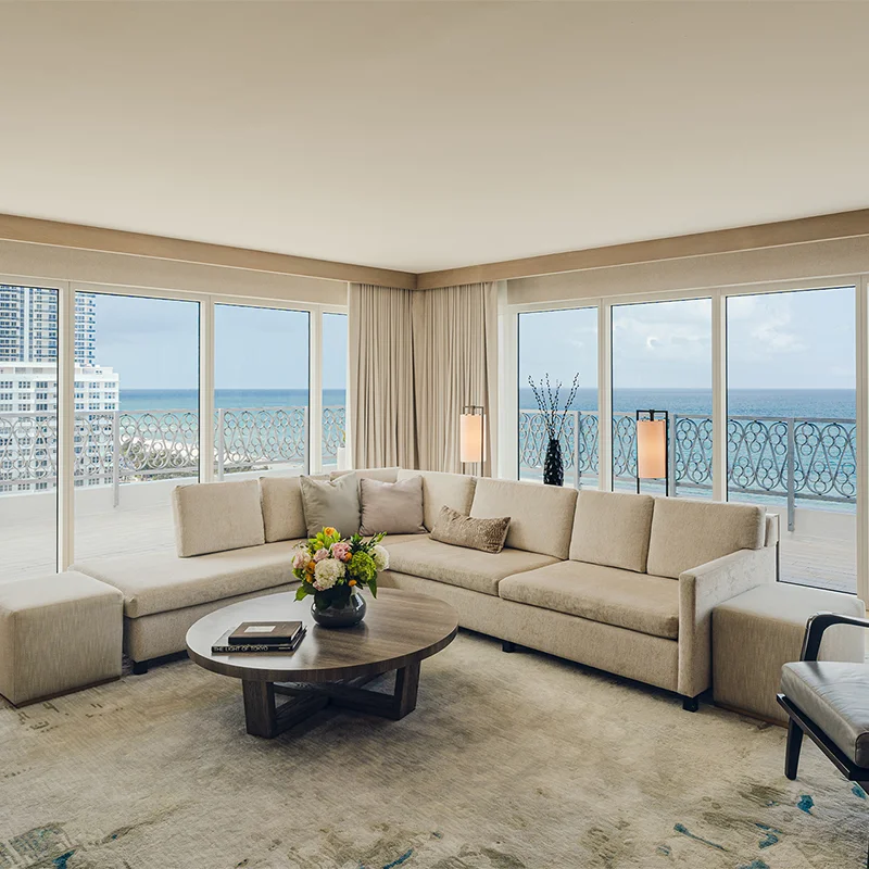 Ventanales de piso a techo que integran el vibrante paisaje de Brickell a su sala de estar privada.